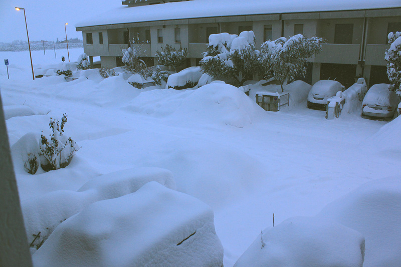 ![]() ![]() ho messo del pane sul terrazzo e gli uccellini se ne sono subito accorti ![]() ![]() Alle 16.30, la neve caduta ha superato i 40 centimetri ![]() Questa la situazione alle 22.00 ![]() ![]() ![]() Ore 06.30 del terzo giorno ![]() Alle 09.00 non nevica e la visibilita' e' aumentata, ma i lampioni sono ancora accesi. ![]() ![]() Lo strato di neve non e' aumentato molto, ma si e' compattato e sostiene il peso dei colombi ![]() continuo a mettere pane per gli uccellini e qualcuno e' ormai diventato cliente fisso ![]() ![]() ![]() ![]() Ore 22.30 del quarto giorno ![]() Ore 07.30 del quinto giorno. E continua a nevicare. ![]() Gli uccellini preferiscono i rami dai quali ho scrollato la neve ![]() questo e' il "solito" pettirosso ![]() ma stamattina c'e' anche questo, con ciuffo ribelle ![]() e un'altra coppia ![]() C'e' sempre più fiducia nei miei confronti e i risultati fotografici migliorano: peccato che non ci sia il Sole ![]() ![]() Tutto ciò, nonostante la presenza costante della gatta ! ![]() "Il Monte" si intravede appena ![]() faccio due passi: notate la stradina per l'accesso alla cabina telefonica e lo spessore della neve caduta. ![]() Sì, e' un'automobile ! ![]() I marciapiedi sono impraticabili e la gente del quartiere va a fare la spesa a piedi, per strada. ![]() ore 21.30 del quinto giorno ![]() Alla mattina del sesto giorno, nuova neve da spalare ![]() Con le catene montate, faccio un giro per Cesena ![]() " La barriera " ![]() Viale Carducci ![]() ![]() Una cinciarella si e' unita al gruppo che frequenta la mia pianta ![]() e nel pomeriggio, anche una ballerina bianca ![]() Ottavo giorno. Decido di fare un giro in campagna e sulle colline ![]() Ci sono almeno 80 centimetri di neve ![]() Raggiungo Montiano ![]() Le macchine sono ancora tutte da liberare ![]() al bivio, prendo la strada di destra che mi sembra più frequentata ![]() A Montenovo, 250 metri sul livello del mare, e' libera una sola corsia ![]() Meglio tornare indietro. ![]() Ma serve un cartello del genere ? ![]() Tornato a casa, trovo la ballerina bianca che mi aspetta per uno spuntino. ![]() Ho lasciato la Romagna nel pomeriggio ( ricovero in ospedale di una nipote) e nei giorni seguenti e' caduta altra neve, raggiungendo 150 centimetri in pianura e causando difficolta' ingenti alla popolazione e agli animali. ![]() |