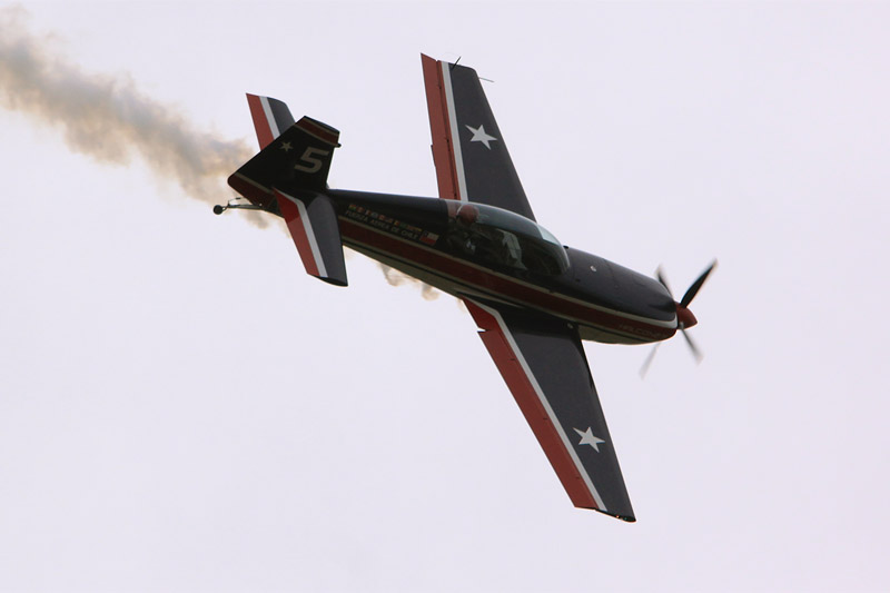 ![]() un motore da 300 hp su una cellula che in totale pesa sui 900 kg. ![]() Il programma ha subìto delle variazioni e delle cancellazioni, ma nel primo pomeriggio ci sono le condizioni per esibirsi. Tecnici e piloti portano gli aerei in piazzale. ![]() Eccoli in decollo, seguiti dal solista, il numero 5 ![]() ![]() incroci ![]() figure perpendicolari al pubblico ![]() e volo a specchio ![]() ![]() con il solista che porta la macchina ai limiti. Sono proprio bravi. ![]() Il giorno successivo il tempo e' discreto e trovo gli aerei gia' allineati in piazzale, ma semi-nascosti da altri velivoli in mostra statica. ![]() L'esibizione e' la stessa, ma la vedo da un'altra posizione ![]() tonneaux a specchio ![]() uscita dal looping ![]() perfetti ![]() apertura sul pubblico ![]() eccoli riuniti ![]() per l'apertura finale ![]() ![]() ![]() ![]() |