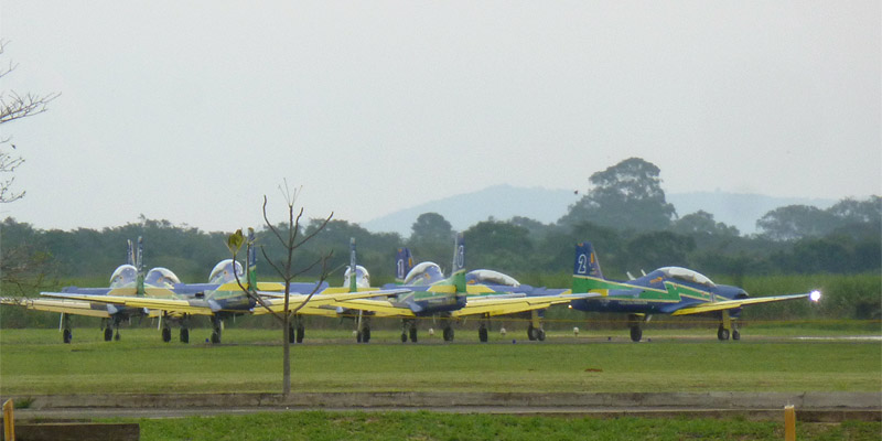 | Nel suo territorio c'e' un aeroporto militare che e' la sede dell'Accademia Aeronautica con relativa scuola di volo ed e' anche la base della pattuglia acrobatica nazionale: la Esquadrilha da Fumaça. Per festeggiare i 60 anni dalla sua costituzione, la Pattuglia ha organizzato due giorni di airshow. La mattina del primo giorno I velivoli sono ben allineati, pronti per esibirsi, ma piove. ![]() ![]() altri due T-27 Tucano con la livrea della Pattuglia sono in una zona decentrata della Base ![]() ed un terzo e' esposto in statica ![]() L'esibizione del mattino e' stata cancellata, ma nel primo pomeriggio il tempo migliora leggermente e non piove. Ne approfitto per due foto con lo sfondo dell' EMB-190 arrivato nel frattempo. ![]() ![]() Finalmente i sette sono in rullaggio ![]() ![]() decollo in formazione ![]() inizia lo spettacolo ![]() e la serie di incroci ![]() i due, lavorano molto bene a specchio ![]() ![]() peccato che il cielo sia così grigio... ![]() sara' l'emozione, ma ci scappa qualche imprecisione ![]() Bella la livrea con i colori nazionali ![]() ![]() un bel passaggio basso sul pubblico ![]() apertura con mezzo looping e atterraggio ![]() ![]() Le scritte sono tutte in portoghese ![]() Il giorno seguente sono previste due esibizioni. Al mattino il cielo e' abbastanza sereno ![]() i velivoli vengono controllati ![]() poi ci si prepara per lo show ![]() eccoli al lavoro ![]() ![]() ![]() ![]() ![]() ![]() ![]() ![]() ![]() ![]() pronti per l'apertura ![]() ![]() Spetta alla Esquadrilha da Fumaça concludere questi due giorni di festa, ma c'e' un albergo a San Paolo che ci aspetta e 230 chilometri da percorrere per arrivarci. Rinunciamo all'ultimo spettacolo per trovare meno traffico ed arrivare a destinazione ad un orario decente. Un'ultima immagine, mentre in macchina stiamo lasciando la Base. Ciao Pirassununga ! Non sapevo nemmeno della tua esistenza e ti ricordero' per sempre. ![]() |