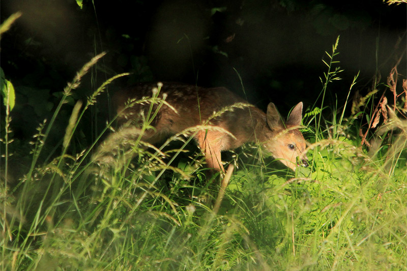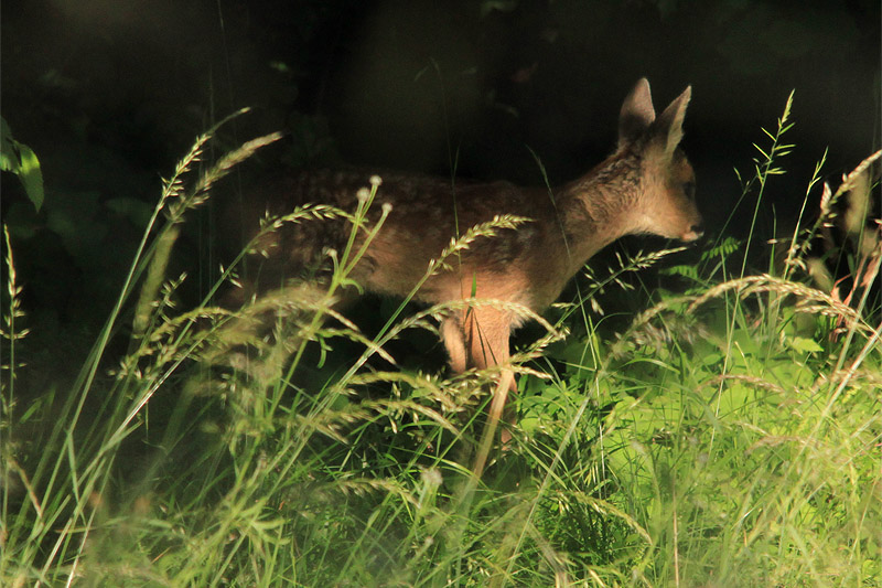 | L'unico movimento che ho visto, purtroppo, e' solo quello di queste due farfalle, sul noce che mi e' di fronte. ![]() al margine del bosco, noto un movimento e istintivamente scatto delle foto, poi le controllo e non credo ai miei occhi: mi sembra un cucciolo di capriolo ! ![]() dopo pochi minuti, eccolo ancora muoversi nella penombra ![]() e curioso, fare nuove esperienze con odori e sapori ![]() poi lo perdo di vista: sparisce tra l'erba alta. ![]() Per tornare alla macchina, decido di attraversare il prato sperando di rivedere il piccolo. Lo vedo eccome ! Anzi sono due, accovacciati uno vicino all'altro ! Il più sveglio si alza e si sposta di qualche metro, l'altro invece se ne sta fermo, un po' tremolante. Ho solo il teleobiettivo e quindi resto a debita distanza: faccio una prima foto ![]() poi una seconda dove si vede meglio. Si alza e si allontana anche lui. Mi allontano per non spaventarli troppo. ![]() Salgo in macchina, percorro poche centinaia di metri e il maschio che speravo di vedere, e' lì a fianco: aziono l'interruttore e il finestrino si abbassa, poi scatto qualche foto e lui resta tranquillo nella sua posizione. Che serata ! ![]() -- O --